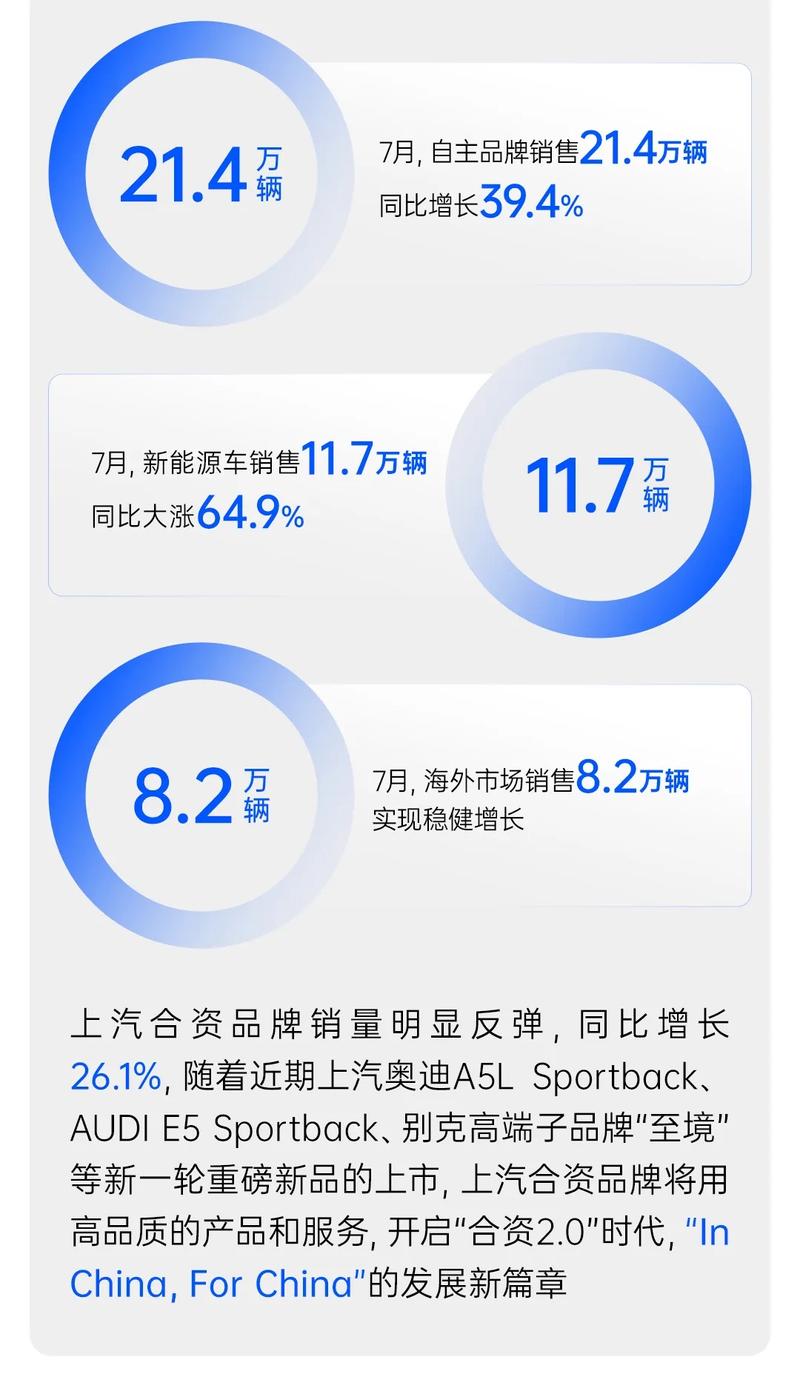 具体来看,自主品牌7月销售21.4万辆,同比增长39.4%。1-7月,自主品牌累计销量达151.8万辆,同比增长23.3%,占公司销量比重达63.5%,较去年同期提升4.3个百分点。新能源车销售11.7万辆,同比大涨64.9%;1-7月累计销售76.4万辆,同比增长43.5%,增速跑赢新能源市场大盘。海外市场销售8.2万辆,实现稳健增长。