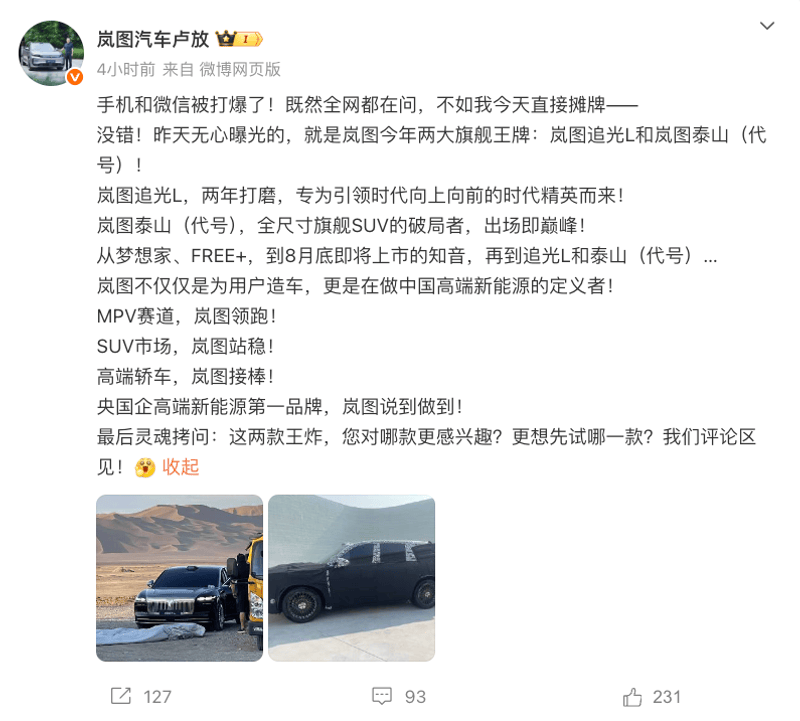 (原标题:卢放:岚图追光L/泰山将于今年发布)