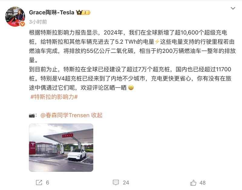 陶琳表示,根据特斯拉影响力报告显示,2024年,我们在全球新增了超10,600个超级充电桩,给特斯拉和其他车辆充进去了5.2 TWh的电量这些电量支持的行驶里程若由燃油车完成,将排放约55亿公斤二氧化碳,相当于约200万辆燃油车一整年的排放量。到目前为止,特斯拉在全球已经建设了超过7万个超充桩,国内也已经超过11700桩。特别是V4超充桩已经来到了内地不少城市,充电更快更省心。