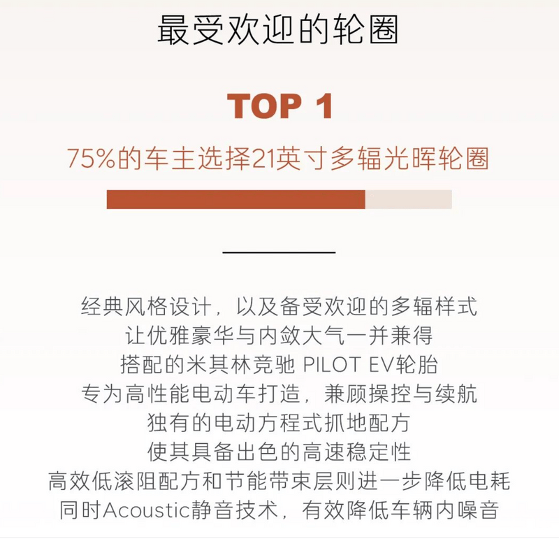 四分之三的用户选择21英寸光晖多幅轮圈;静岳黑、辰辉银、岩脊棕是人气最高的三个颜色;月榕棕、云缦米是最受欢迎的内饰色;8成用户选择了展翼电动踏板;超7成用户选择了BaaS电池租用购买方式。