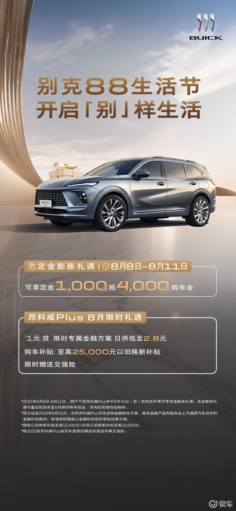 易车讯 别克品牌盛大开启“88生活节”限时购车礼遇:8月8日至8月11日期间,用户下定昂科威Plus、君越等车型,即可享受1000元定金抵4000元购车金。值得一提的是,本次定金膨胀礼遇可在“一口价”基础上,叠加“1元贷”金融方案以及至高25000元置换补贴等多重优惠。