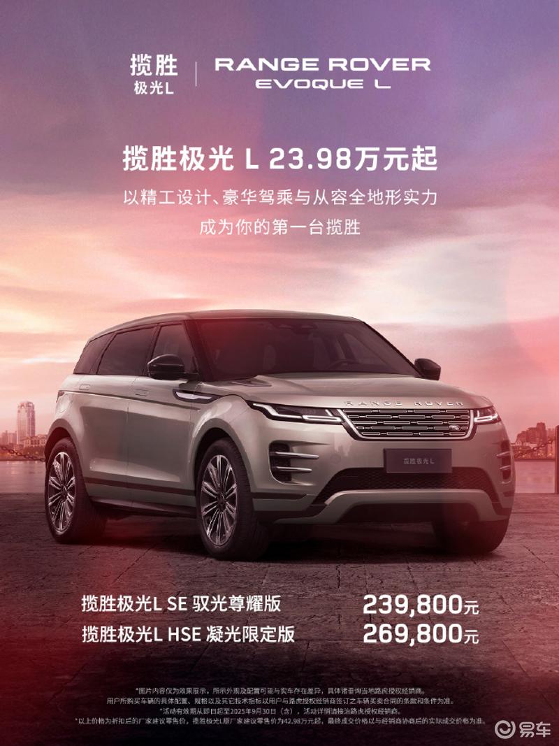 易车讯 8月15日,揽胜RangeRover官方发布,路虎揽胜极光L推出限时优惠,降价幅度最高达20.6万元,活动从即日起至2025年9月30日止。