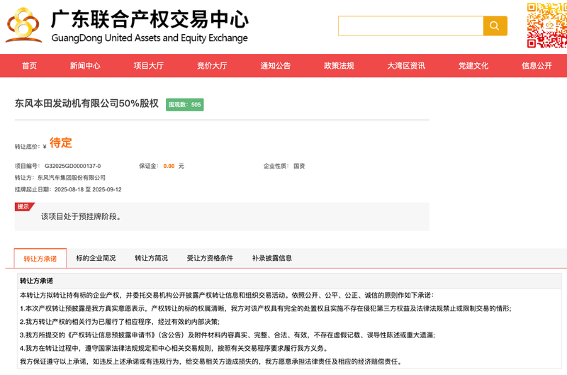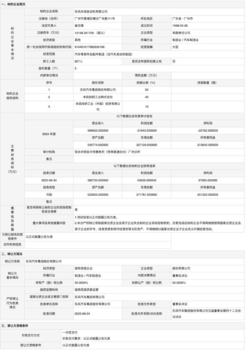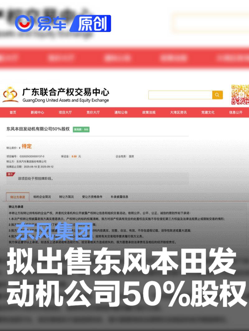 易车讯8月18日,广东联合产权交易中心官网今日披露,东风汽车集团股份将出售东风本田发动机公司50%股权,转让底价待定,目前该项目处于预挂牌阶段,挂牌截至日期为9月12日。