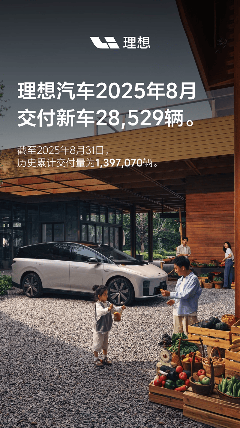 (原标题:理想汽车8月交付28529辆,累计交付1397070辆)