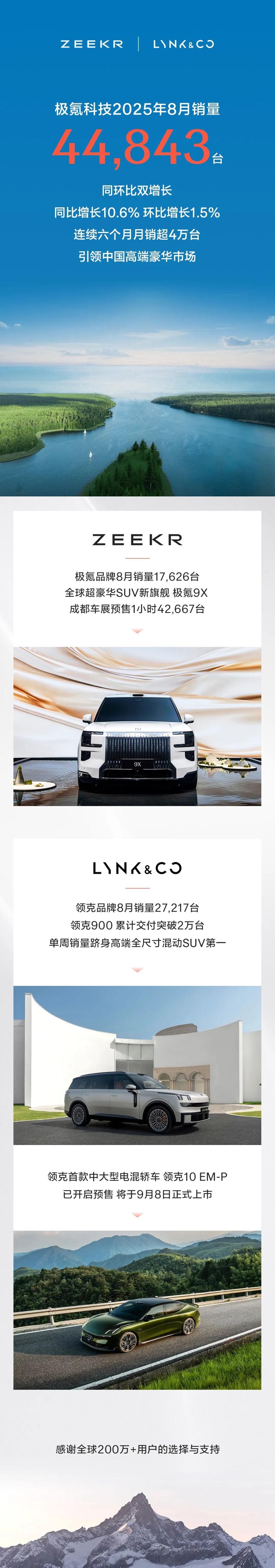(原标题:极氪科技8月销量44843台,连续六个月月销超4万台)
