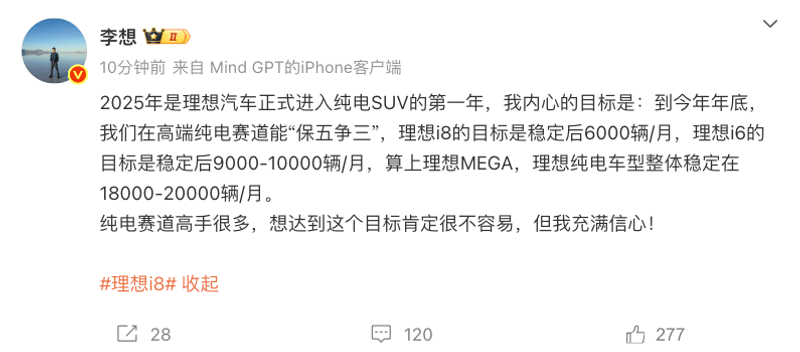 易车讯 9月1日,理想汽车CEO李想在微博上发文称,2025年是理想汽车正式进入纯电SUV的第一年,我内心的目标是:到今年年底,我们在高端纯电赛道能“保五争三”,理想i8的目标是稳定后6000辆/月,理想i6的目标是稳定后9000-10000辆/月,算上理想MEGA,理想纯电车型整体稳定在18000-20000辆/月。