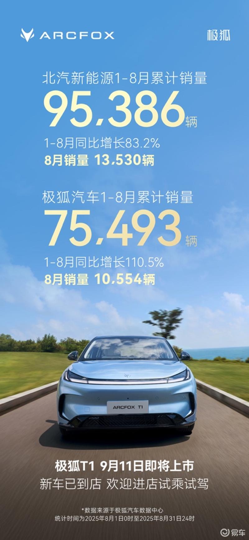 (原标题:北汽新能源1-8月累计销量95386辆,极狐1-8月累计销量75493辆)