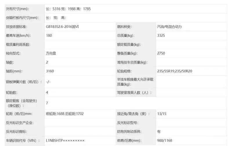 尾部方面整体造型同样没有变化,但后包围细节与纯电版有所不同,下部黑色饰板并未采用贯穿设计。车身尺寸方面,新车长宽高分别为5316/1988/1785mm,轴距为3160mm。