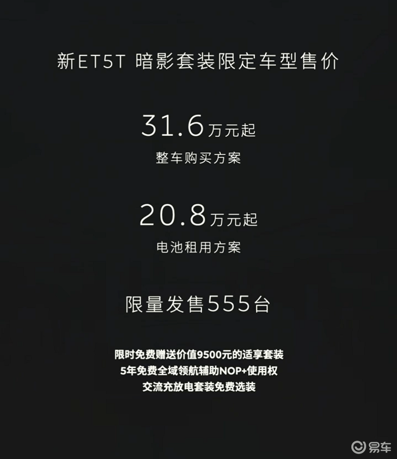 蔚来新ET5T暗影套装限定车型上市,售31.6万元起