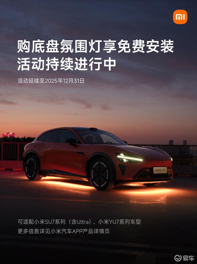 易车讯 10月31日,小米汽车宣布底盘氛围灯免费安装服务延续至12月31日,SU7(含 Ultra)/ YU7系列用户可前往小米汽车App商城选购,售价为999元。
