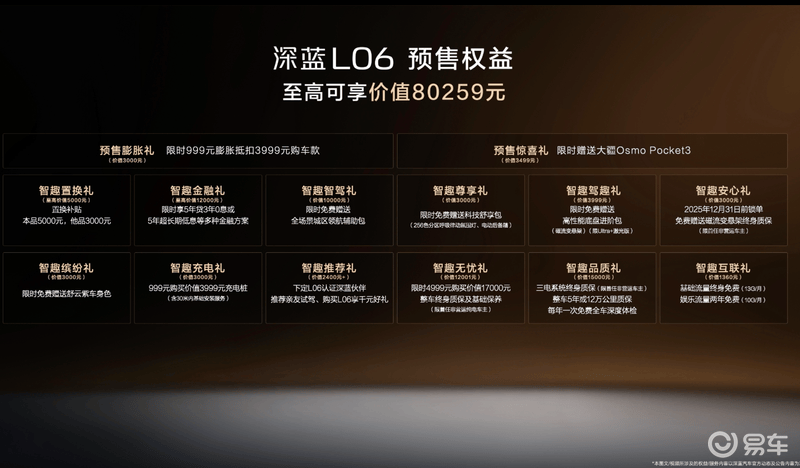 同时官方宣布,用户至高可享价值80259元的预售权益,包括限时999元膨胀抵扣3999元购车款;限时赠送大疆Osmo Pocket3;至高5000元置换补贴等权益。 外观方面,新车采用了深蓝家族最新的设计语言,前脸造型较为简洁,两侧隆起的筋线看起来力量感十足。据官方介绍,新车车灯组是从自然界中提取无尽灵感,以寒兰和冰晶作为灵感原型,创造新款绽放的花瓣灯样式,整体看起来十分新颖。 来到车侧,我们可以看到新车整体采用了极具运动感的设计语言,看起来动感十足。同时,新车的后视镜位于门板上方。车身尺寸方面,新车长宽高分别为4830*1905*1480mm,轴距为2900mm。 此外,新车全系标配激光雷达,预计在智能驾驶辅助功能上将会拥有不错的表现。同时,新车将搭载3nm车规级座舱芯片,将带来更流畅、智能的人机交互体验。 尾部方面,深蓝L06配备微微上翘的小鸭尾造型,搭配下方的大尺寸扩散器,进一步营造车辆的运动属性。同时,新车还将采用贯穿式尾灯组,中部为品牌Logo,丰富尾部视觉层次感。 内饰方面,新车采用了经典的T字形布局,新车三幅式方向盘为特别设计,配备了滚轮和摁钮两种调节方式。此外,新车配备了大尺寸的中控大屏,下方为空调出风口。同时,新车配备了50英寸AR-HUD。动力方面,深蓝L06纯电动版车型将会搭载200kW电机。 打开易车App,进入“易车榜”,查看最新最全汽车产业数据