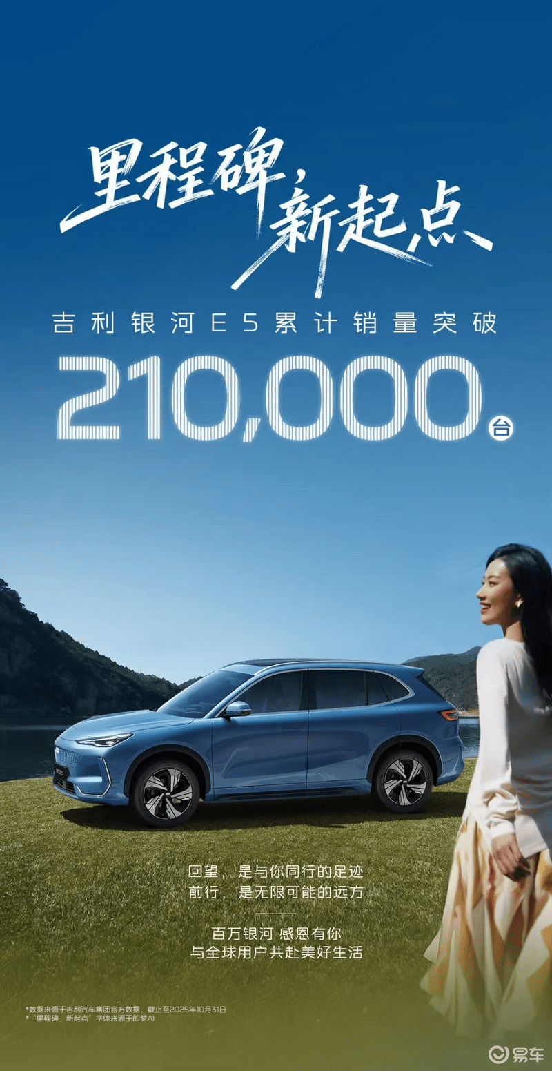 易车讯 11月3日,吉利汽车官方宣布,银河E5累计销量突破21万台。吉利银河E5定位为纯电动紧凑型SUV,官方指导价10.78-17.98万元,CLTC纯电续航里程为440-610km。