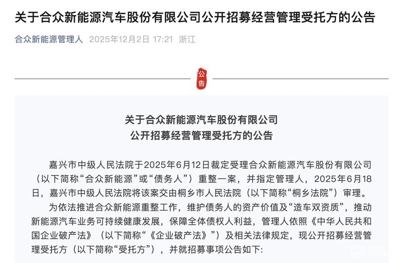 易车讯 日前,合众新能源管理人在官方公众号发布了《关于合众新能源汽车股份有限公司(哪吒汽车母公司)公开招募经营管理受托方的公告》。公告表示,为依法推进合众新能源重整工作,维护债务人的资产价值及“造车双资质”,推动新能源汽车业务可持续健康发展,保障全体债权人利益,管理人依照《中华人民共和国企业破产法》(以下简称“《企业破产法》”)及相关法律规定,现公开招募经营管理受托方(以下简称“受托方”),并就招募事项公告如下: