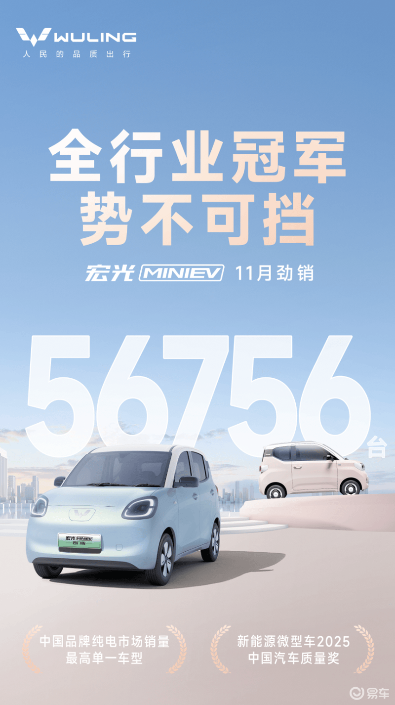 其中宏光MINIEV 11月销量56756台,占据52.3%的市场份额,是中国品牌纯电市场销量最高单一车型,荣获新能源微型车2025中国汽车质量奖。