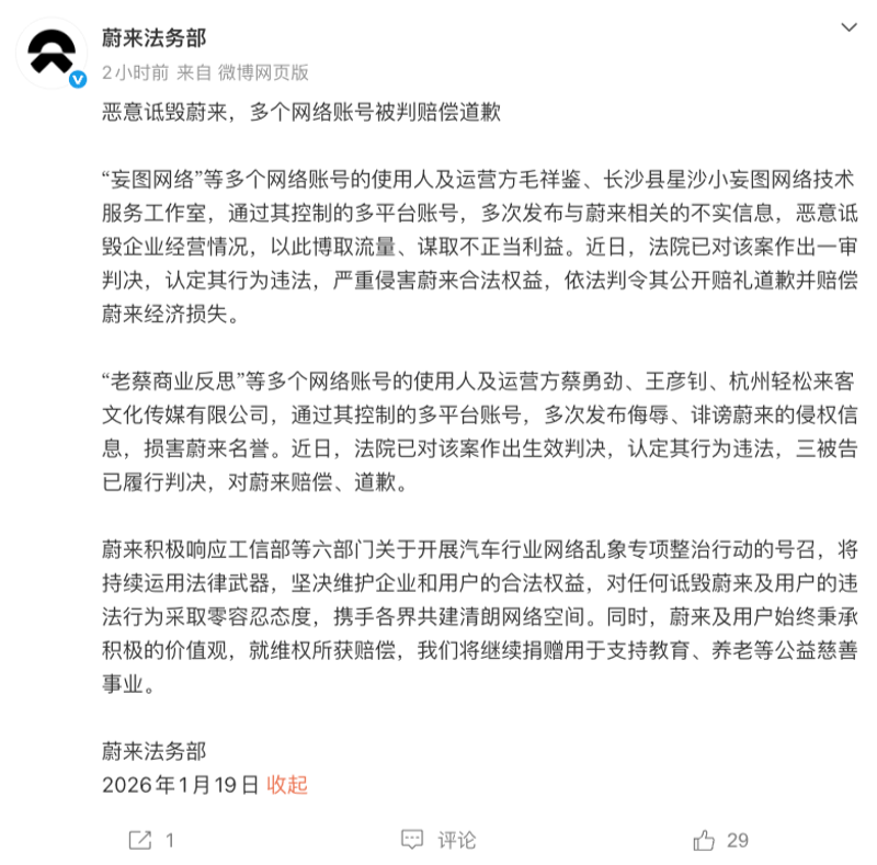 (原标题:蔚来法务部:多个恶意诋毁蔚来网络账号被判赔偿道歉)