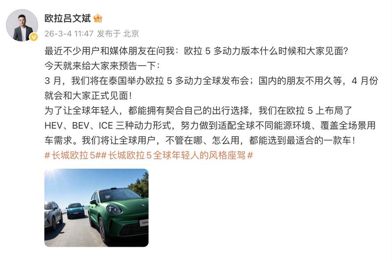 易车讯 3月4日,长城汽车欧拉品牌总经理吕文斌在社交媒体上宣布,3月将在泰国举办欧拉5多动力全球发布会,国内的朋友不用久等,4月份就会和大家正式见面。欧拉5布局了HEV、BEV、ICE三种动力形式,纯电版本此前已经上市,而燃油和混动版也已在工信部2月的申报信息中出现。