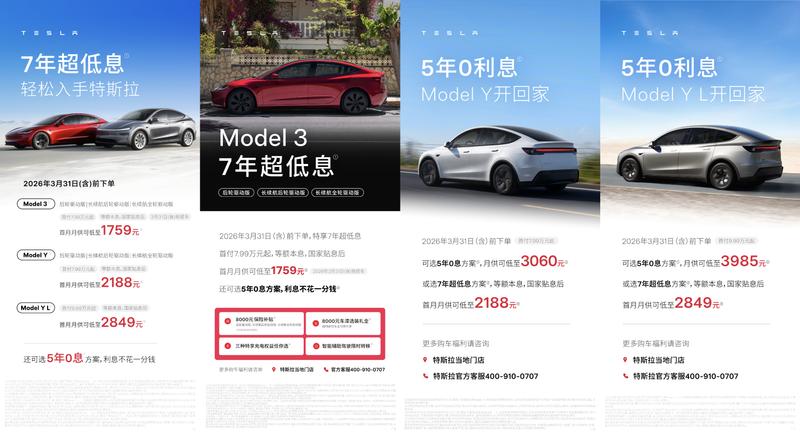 3月,特斯拉中国推出全新的购车福利政策和引荐购车政策:3月31日前完成车辆交付,购车人可享受8000元限时车漆选装福利,无需通过引荐下单;3月31日前老车主引荐朋友下单,在完成车辆交付后,老车主可获得800 Tesla积分。结合目前特斯拉中国上线的限时购车福利:2026年3月31日前订购Model 3 / Model Y(全系)可享首付7.99万元起的7年超低息方案,国家贴息后首月月供分别低至1759元与2188元;Model Y L可选择首付9.99万元起的7年超低息方案。现在入手特斯拉车型,还可选择5年0息方案,并可任选四种特享充电权益之一,智能辅助驾驶能力亦可限时转移至新车。