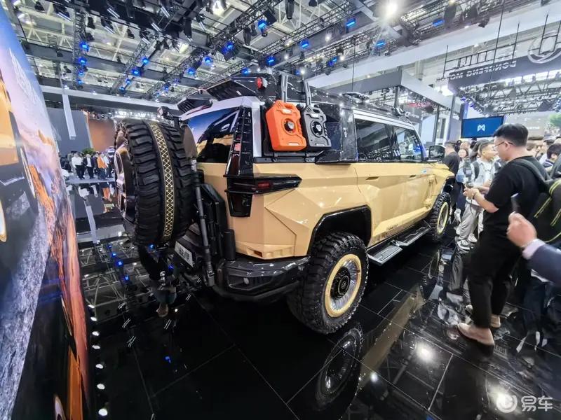 车尾方面,新车使用了类似十字形的尾灯设计,力量感十足。同时,新车的尾厢门采用了电吸侧开方式,并悬挂了超大尺寸的备胎箱,底部的保险杠也与车头形成呼应。