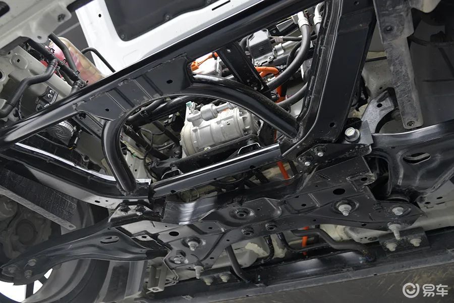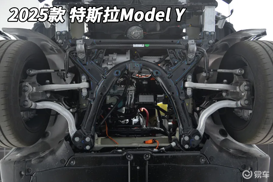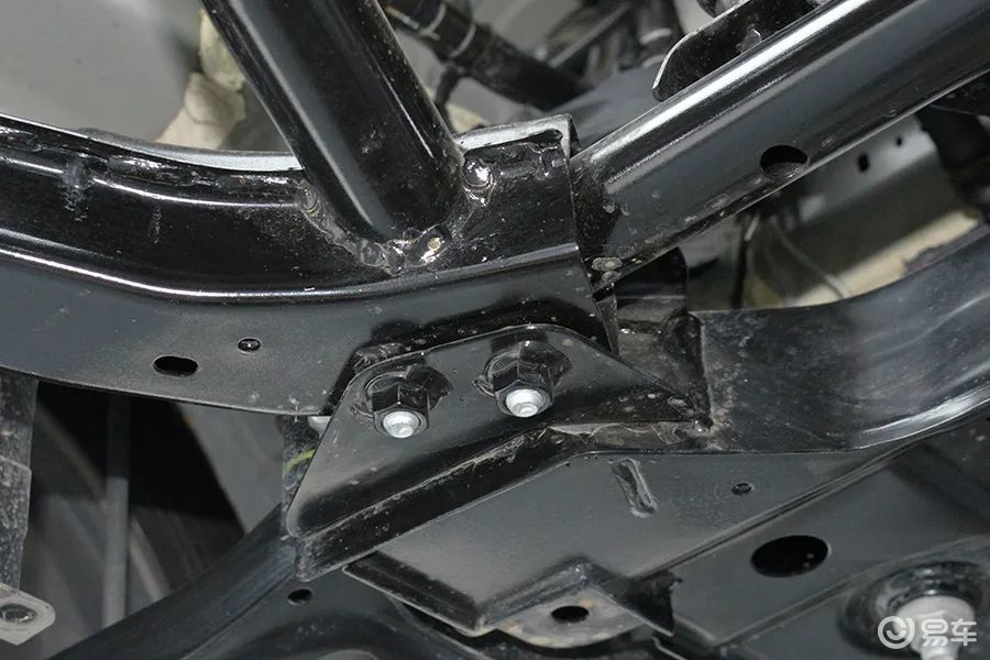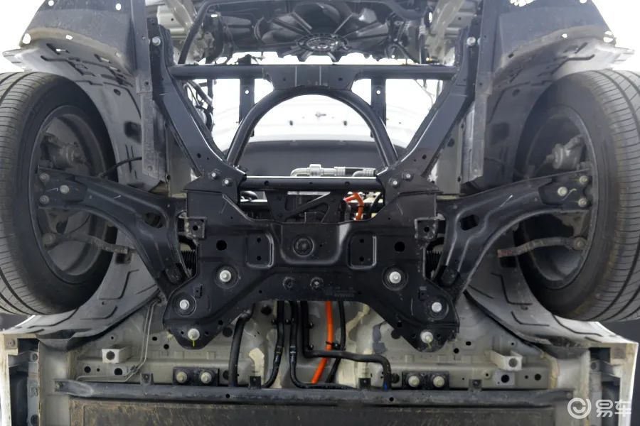 前副车架是全框式结构,有一根半圆形的加强梁(类似于特斯拉),来增加底盘强度。副车架后方还有一个传统的一体式副车架,两部分通过螺栓进行连接。