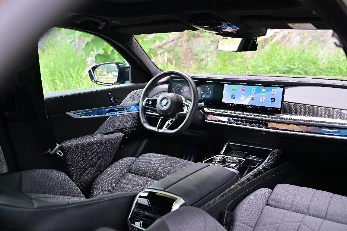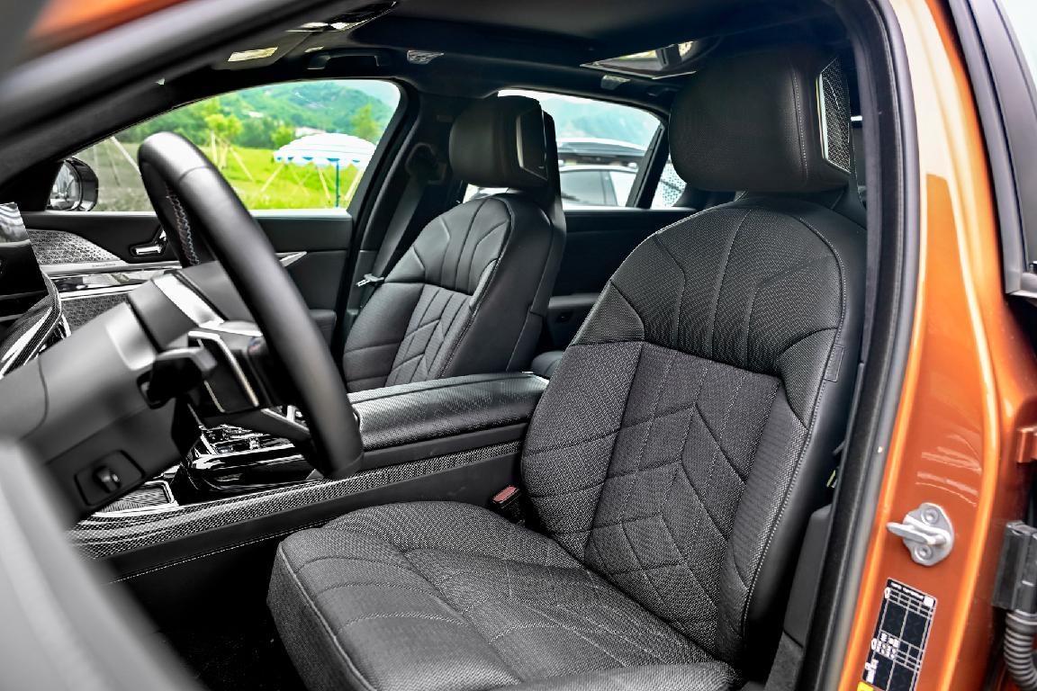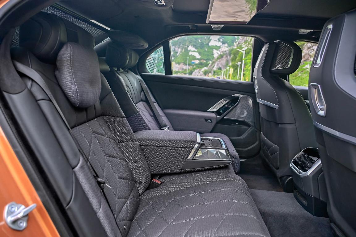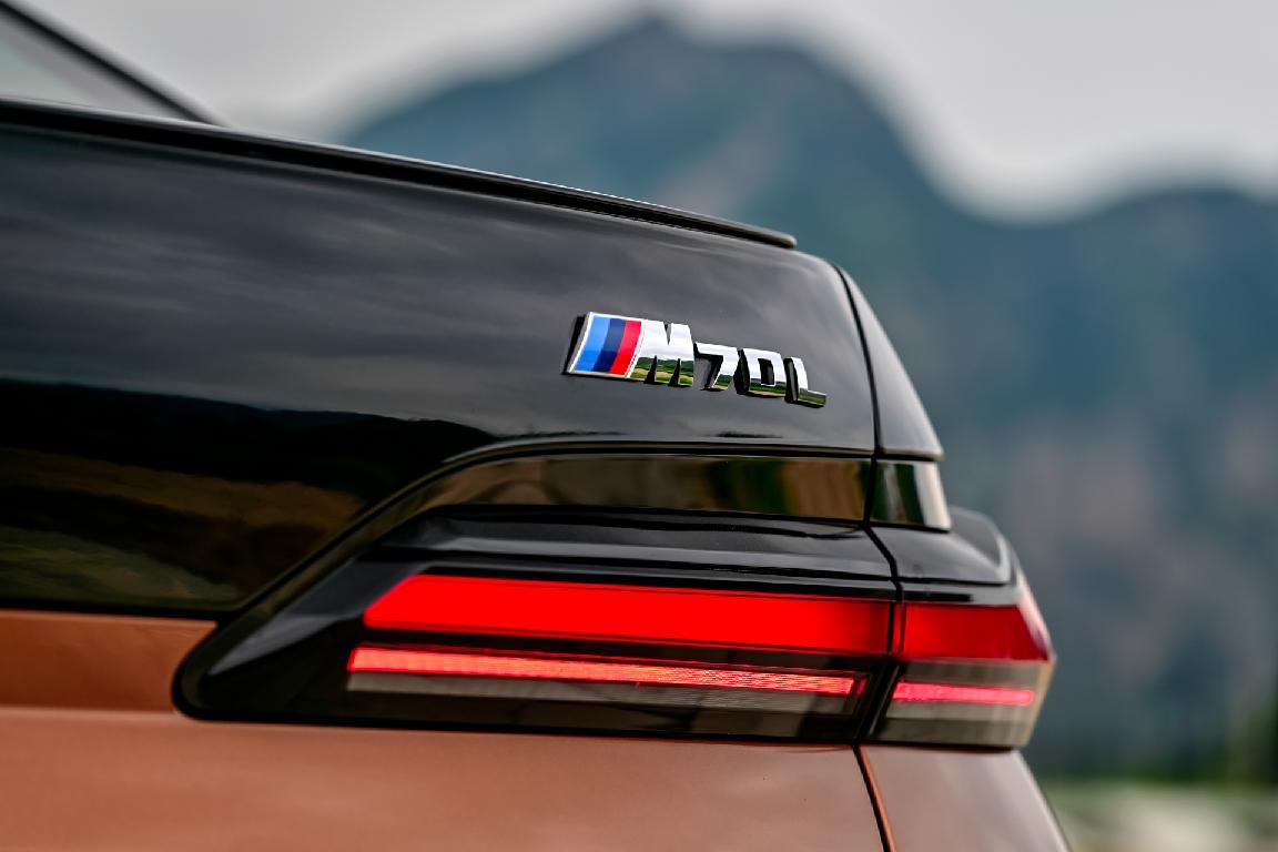 霍夫迈斯特拐角、平直的腰线以及整体修长的造型,作为一辆来自于BMW的旗舰轿车该有的“性格”、“脾气”与“精致感”都已具备,但是作为一辆纯电动轿车,似乎又显得太过保守。保守到除了尾标,什么都不是专属,完全没有老对手们玩儿的嗨,甚至是连形状都变了,好在饱受争议的前脸设计、内凹式感应车门把手、轮圈以及尾灯等细节已足够吸引人眼球,不用以新能源为噱头再过分渲染了。当然,作为旗舰中的旗舰,M70L自备了M Sport运动套件和双色车身漆面,这让保守与夸张并存,整体看起来似乎还算是和谐。