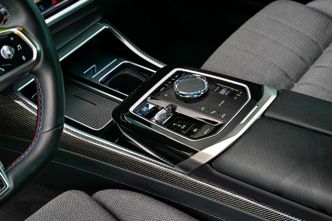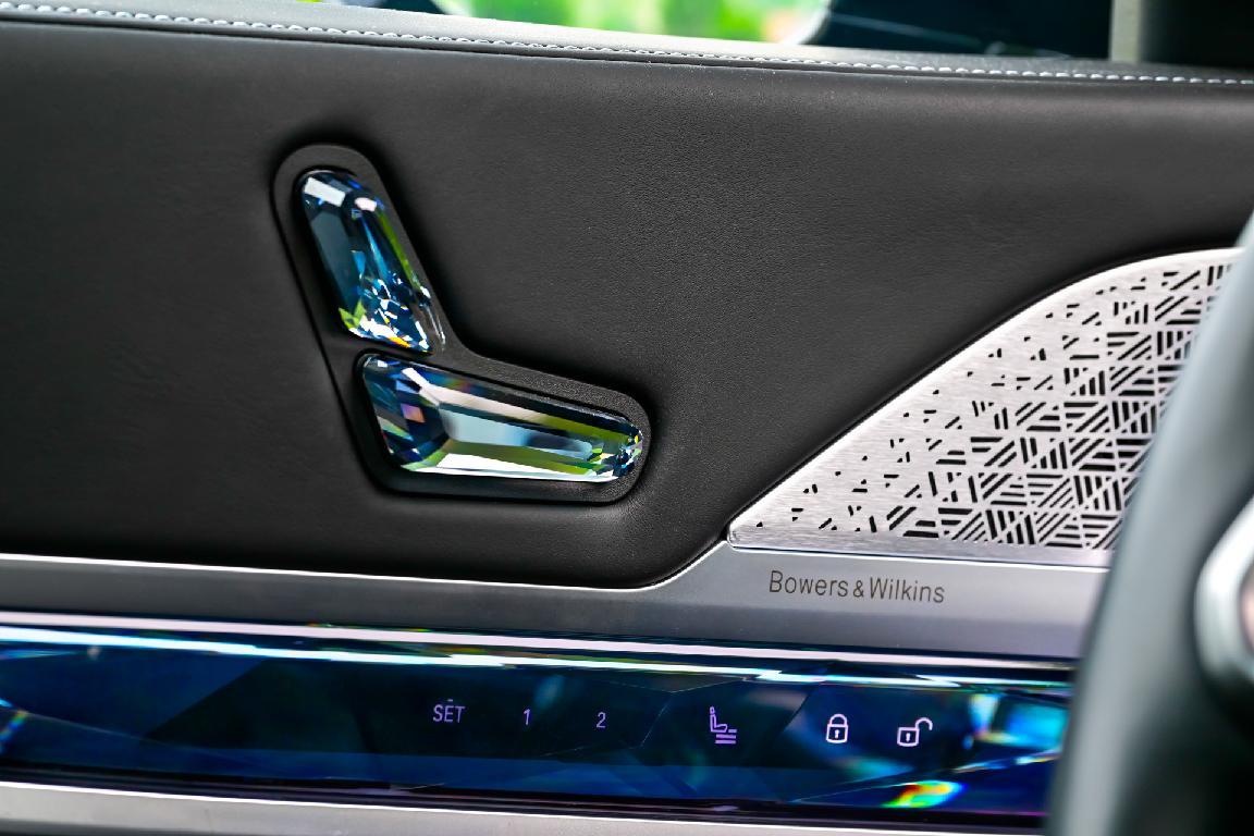 在上一代堆满按键的中控区域被直接删除,留下了一个空荡荡的区域,下方连接着手机无线充电板和一个很小的储物空间。常用的空调系统被内嵌在了交互光带之中,同时,伴随着延伸至车门两侧的光带,还巧妙地将灯光控制、触控车门开关按键、门锁、座椅设置等常用功能内嵌其中,配合设计在车门上方的座椅角度调节水晶按键,便利性相比老款有了提升。值得一提的是,i7 M70L可以使用语音关闭单个车门,你可以说“嗨!BMW,关闭车门。”系统会寻找声音的来源,并关闭对应的门。