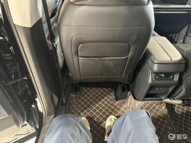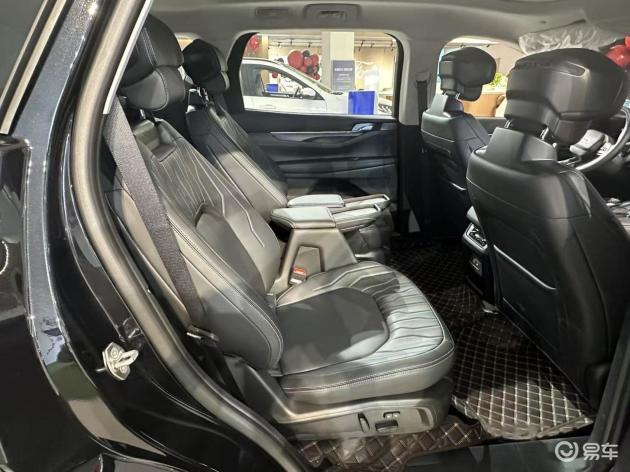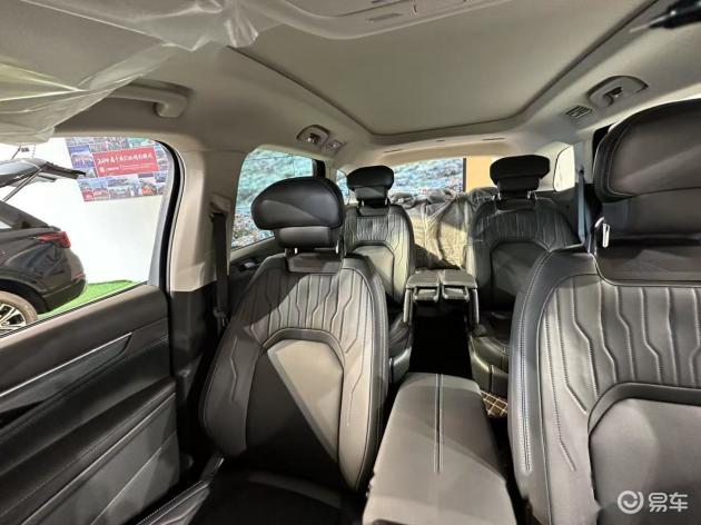 我特意体验了第三排座椅,以我1米75的身高,在第二排留有一拳腿部空间的情况下,坐到第三排,膝盖刚好顶到第二排椅背,但并不感到特别压抑,短途应急或乘坐儿童完全不成问题。销售人员提到,顶配旗舰型的第二排座椅采用与某些百万豪车同款的半苯胺真皮,我们试摸后,确实感到手感更为细腻柔软。不过,考虑到预算,至尊版的皮质已经相当出色。