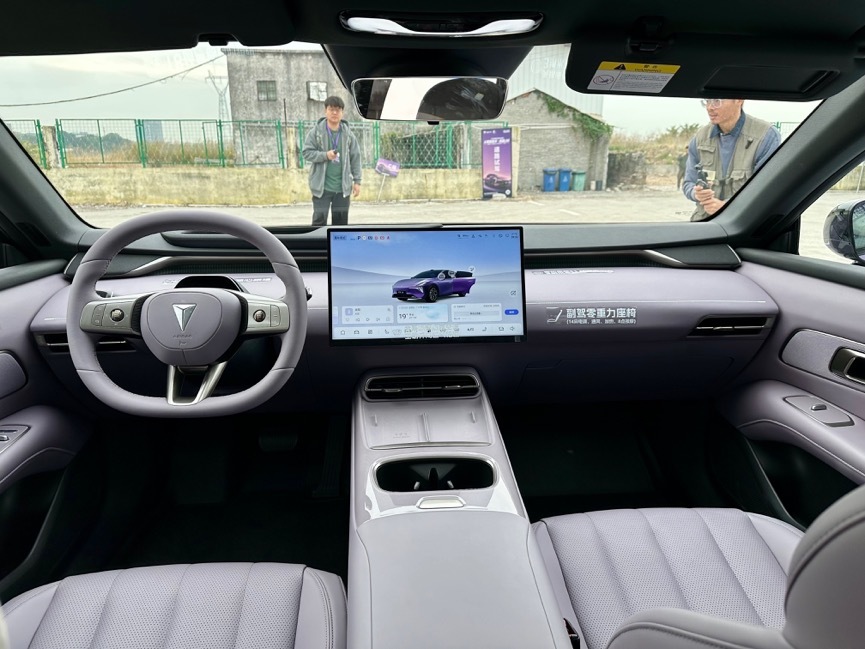 溜背式造型和尾翼动作在光影下显得更立体,是一种“不会刻意取悦人,但你一旦看懂就会喜欢”的风格。车门拉开后,内饰质感比我预期高级:大量的软包材质、低饱和色彩搭配、细腻的氛围灯过渡,都让它的车内空间显得比同价位更从容。后排空间也比预想的宽裕,天幕隔热明显,不会有“晒头”的烦恼。如果只从静态部分判断,它完全具备一台家用轿跑该有的舒适基础。