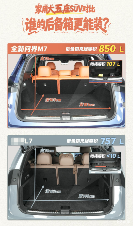 更贴心的是,后备箱还配备了107L的储物暗格,能放下两箱矿泉水或一些贵重物品,既实用又隐蔽。对比之下,某豪华品牌SUV的后备箱常规容积仅550L,放倒后排后也无法满足大件装备的装载需求。某新势力品牌SUV的后备箱虽有750L左右,但储物暗格甚至小于10L,影响实用性。
