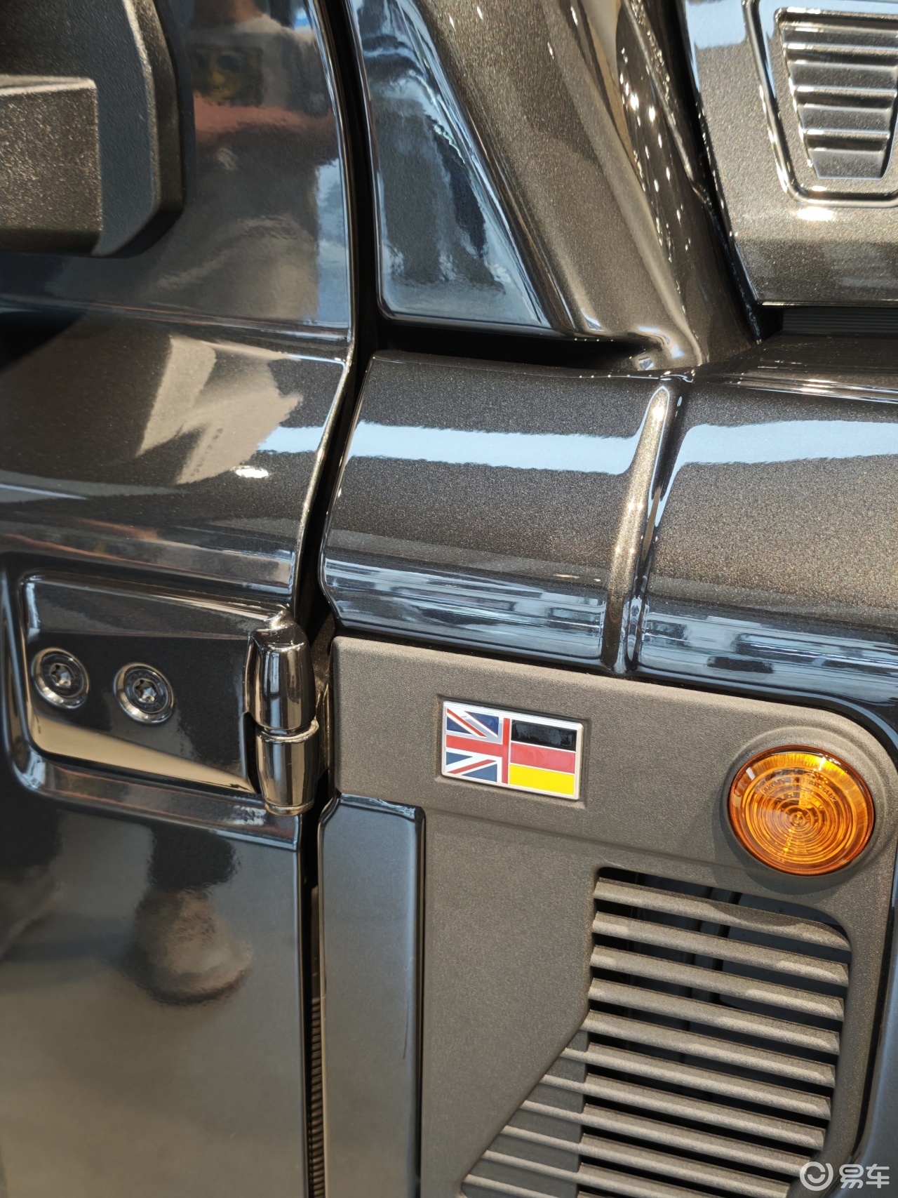 你能在两个大圆灯中间看到两盏有点突兀又有点憨态可掬的探照灯,在机盖上看到“Powered by BMW”,在翼子板上看到一半英国国旗一半德国国旗拼凑的图案,这或许代表着“英国血统”和“德法边境制造”吧。走到车尾,看到的是一对圆圆小小的、高度集成各种灯具功能的尾灯,外挂备胎、观音门和方正的车体形成了奇妙的反差感。