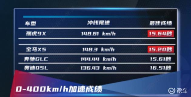 在直线加速项目中,瑞虎9X展示了新一代动力系统的成熟度。搭载鲲鹏2.0T引擎的瑞虎9X不仅在起步阶段迅速建立爆发力,在0-400米全程中更以148.61 km/h 的尾速领先所有德系对手。这一测试不仅比0-100 km/h加速更能体现发动机中后段的持续能力,也展示了自研动力总成的整体效率。曾经被认为是德系优势的动力表现,如今正被中国新燃油技术逐步重构标准。