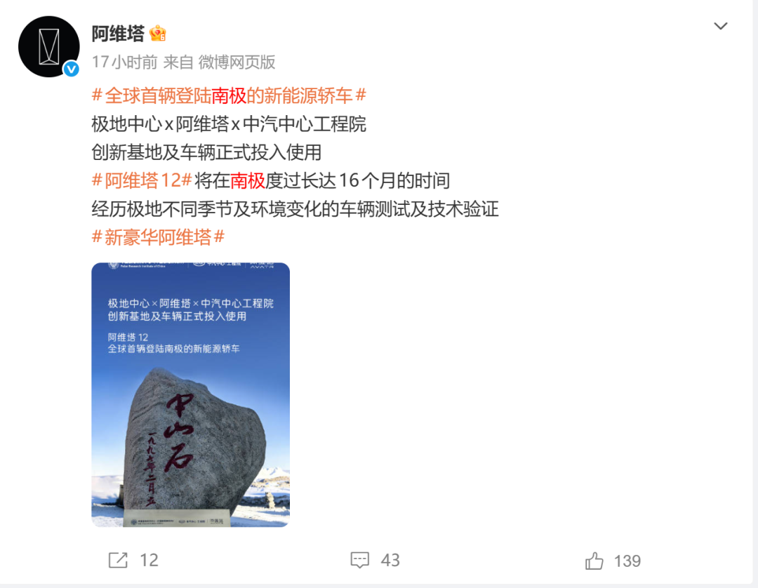 12月8日,阿维塔通过社交媒体宣布,旗下旗舰车型阿维塔12正式抵达南极,以全球首辆登陆南极的新能源轿车的名义,直面-50℃极寒,勇闯“无人区” ,开启科考之旅。