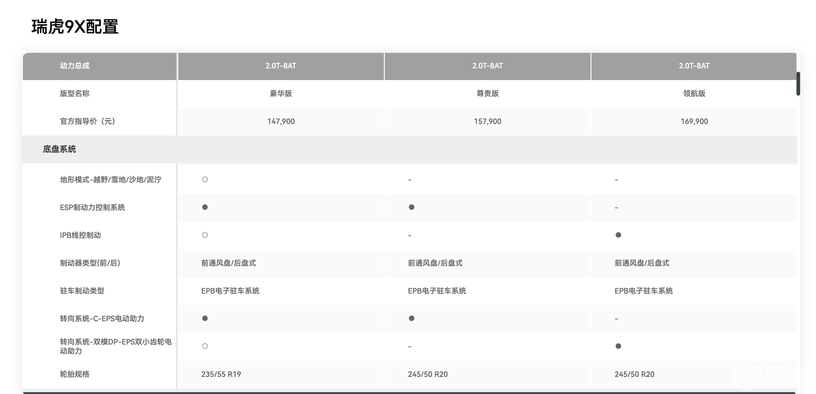 在瑞虎9和瑞虎9X的配置表上,我们都可以看到两种制动和转向系统形式,即:ESP制动力控制系统和IPB线控制动;C-EPS电动助力和双模DP-EPS双小齿轮电动助力。