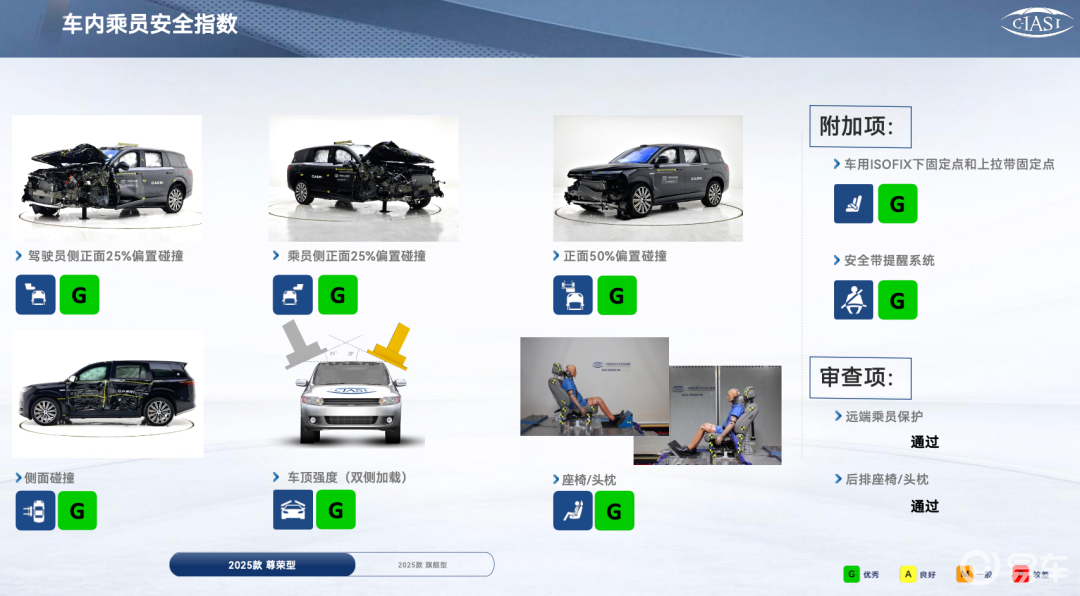 腾势N9 2025款奥迪A5 Sportback 2026款大众探岳L 2025款理想i8 2025款成绩上总体不错,特别是腾势N9和理想i8拿到了G/G+的五项全优成绩。
