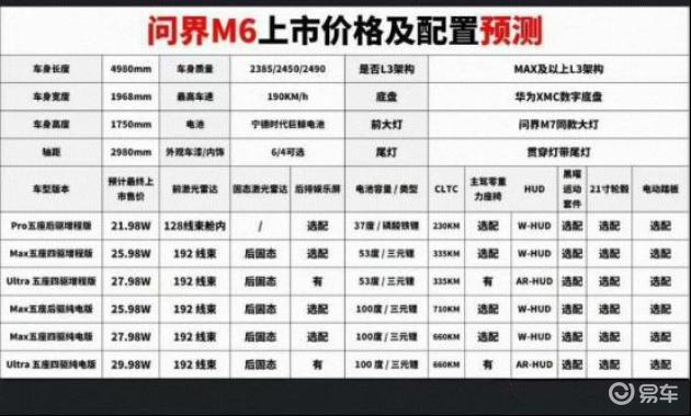 同时,与问界M6的冰雪测试视频一同曝光的还有一张上市价格与配置预测表。根据该表,问界M6是一款车长4980mm、轴距2980mm的中大型SUV,提供纯电和增程两种动力版本。配置方面,M6与问界M7相同,提供主驾零重力座椅选项,并配备了舱内激光雷达和192线激光雷达+后向固态激光雷达两种辅助驾驶硬件方案。