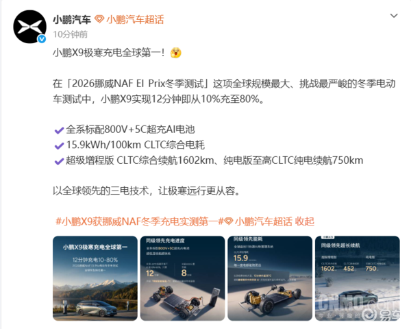 【CNMO科技消息】在极寒环境中充电缓慢,曾是困扰全球电动车用户的核心痛点。2月9日,小鹏汽车官宣,在全球规模最大、挑战最严峻的“挪威NAF ElPrix冬季测试”中,小鹏X9凭借12分钟从10%充至80%电量的极致表现,在极寒充电项目中夺得全球第一。