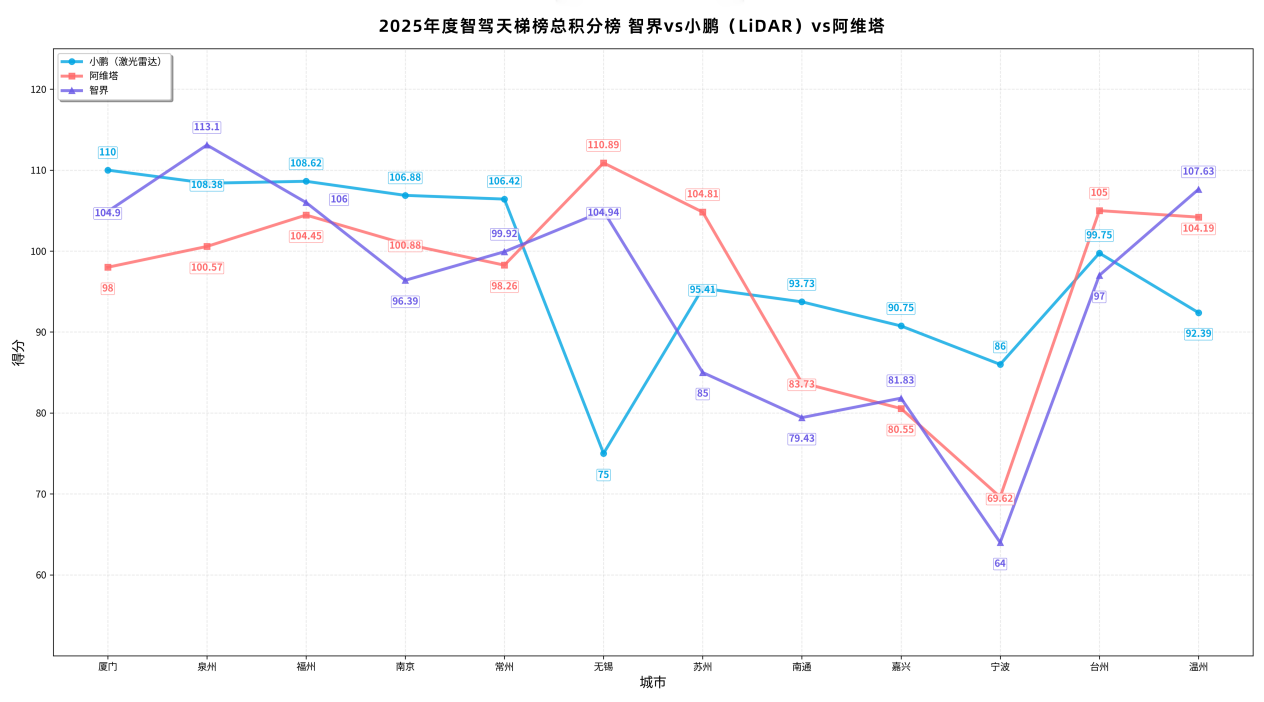 后期反弹,出现在宁波站至温州站(2026年1月10日)。在这个阶段,智界连续三站成绩大幅提升,核心原因是华为乾崑智驾ADS 4上车,新版本强化了如内部路等复杂场景的能力,最终在年度收官战温州站,智界第二次实现了对两家品牌的反超。