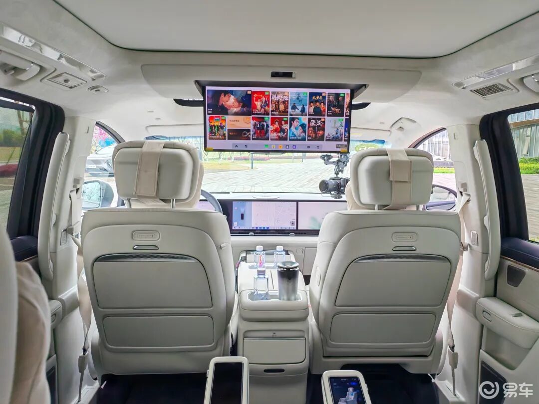 此外,车内配有后排侧窗遮阳帘、二排零重力座椅、三联屏 + 21 寸后排屏 +50 寸 AR-HUD + 双 5.5 寸二排移动管家屏、以及可制冰冷暖冰箱等,应有尽有。