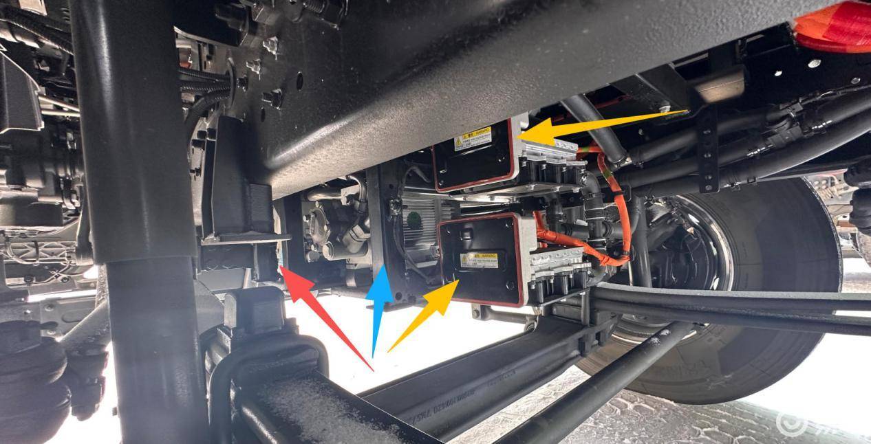 参加这次黑河低温测试的Q3超级电动卡车,驾驶舱与梯形车架之间,清晰可见热管理系统的电动空调压缩机和PTC预热模块(红色箭头所指),而动力电池总成紧贴在Q3超级电动卡车驾驶舱后端,缩减冷却管路长度,降低“冷量”和“热量”丧失导致的低效率。