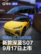 易车讯 我们从深蓝汽车官方获悉,新款深蓝S07将于9月19日上市。该车在9月8日已开启预售,共推出5款车型,预售价15.69-17.39万元。 外观方面,新车整体延续了家族式设计理念,依旧采用分体式大灯...